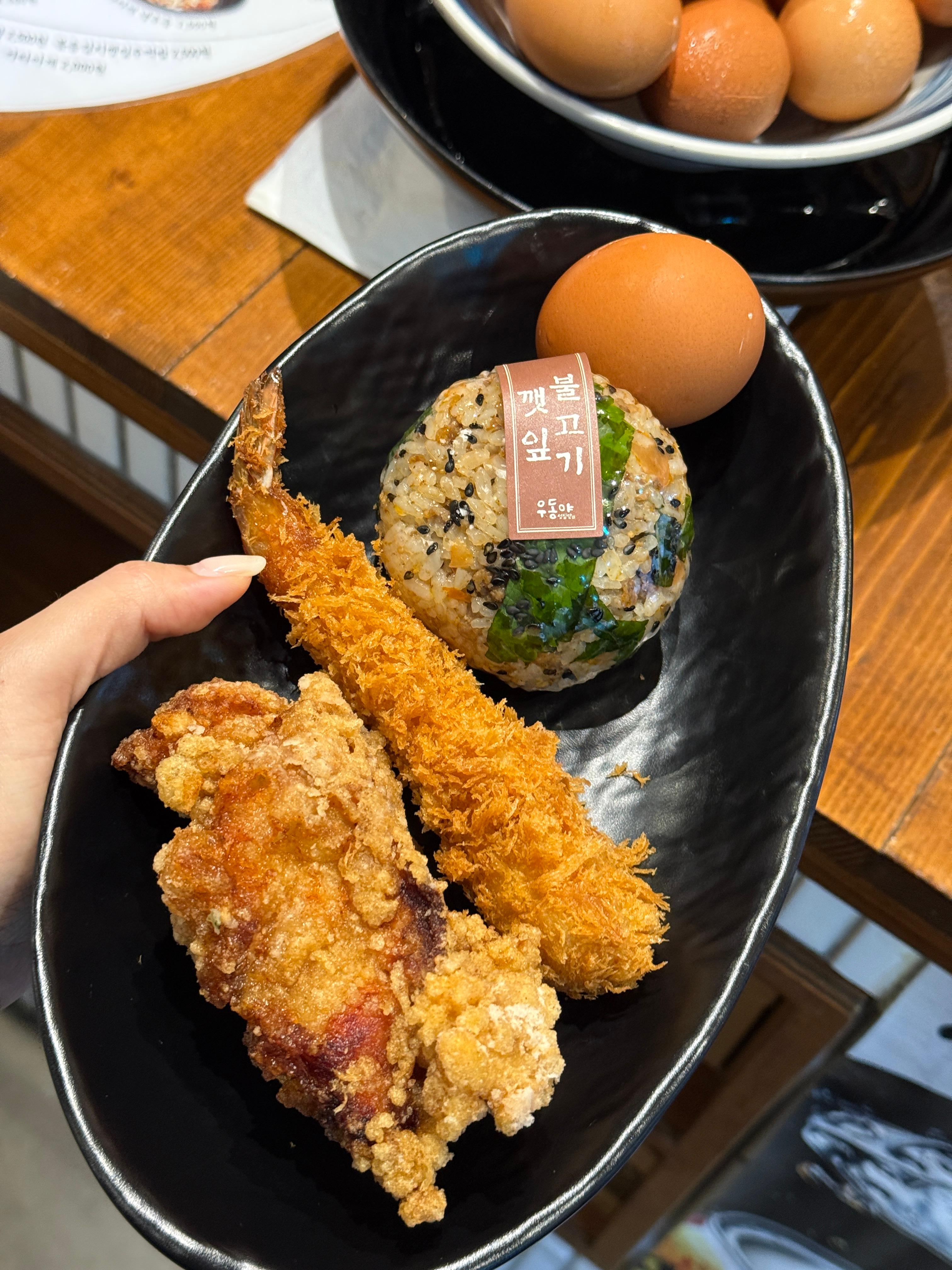 새우튀김 하나, 치킨 가라아게, 주먹밥 그리고